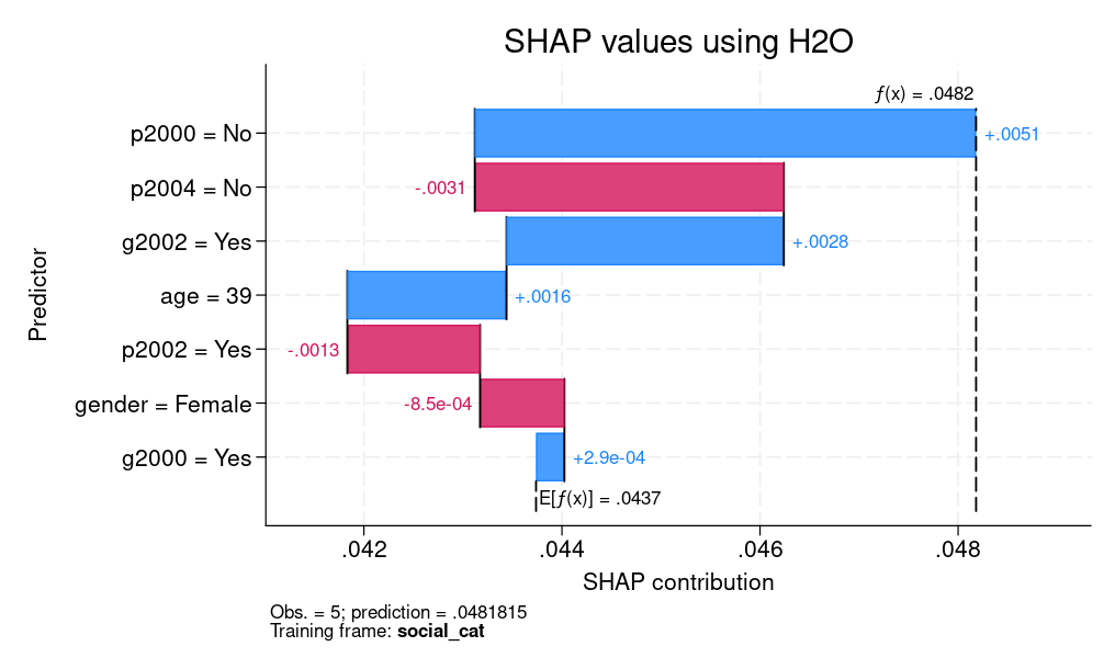 Figure 2 presents both SHAP values for an individual prediction and a PDP for age. For SHAP values, we explain the fifth observation, which corresponds to a female who is 39 years old. We can see that the age of 39 and voting in the 2002 general elections but not voting in the 2000 primary elections contribute positively to explaining the difference between the individual’s CATE prediction (0.0482) and the average prediction of 0.0437. However, not voting in the 2004 primary elections had a negative contribution.