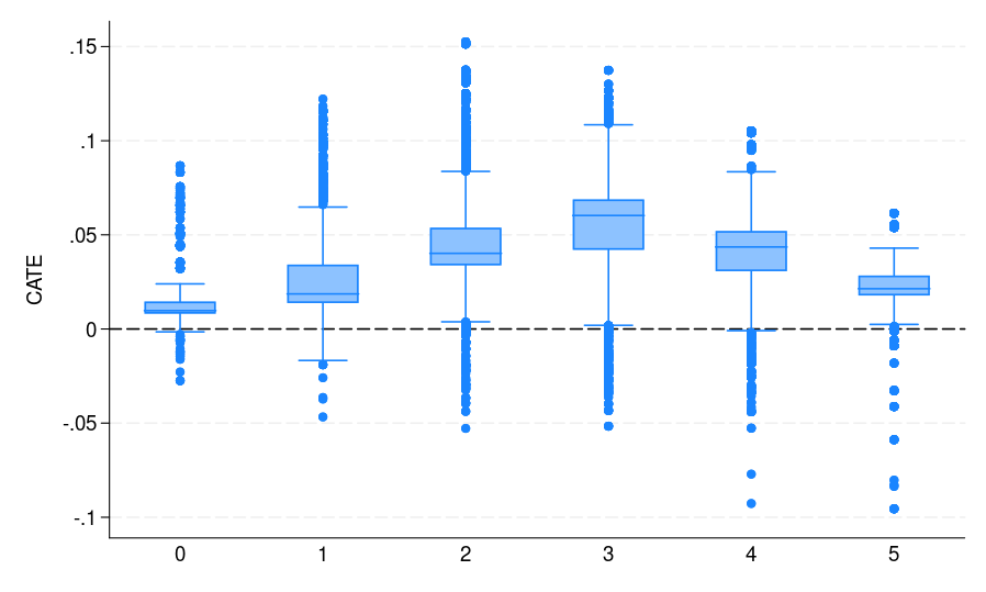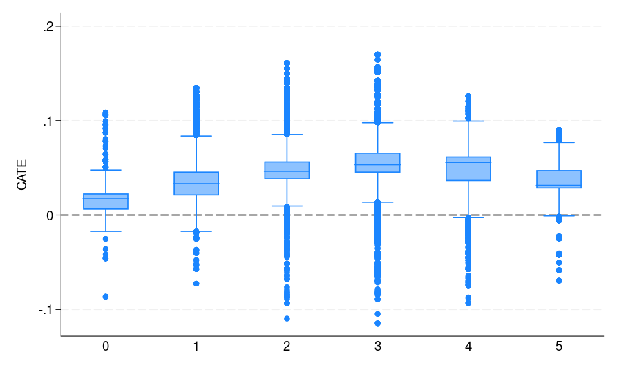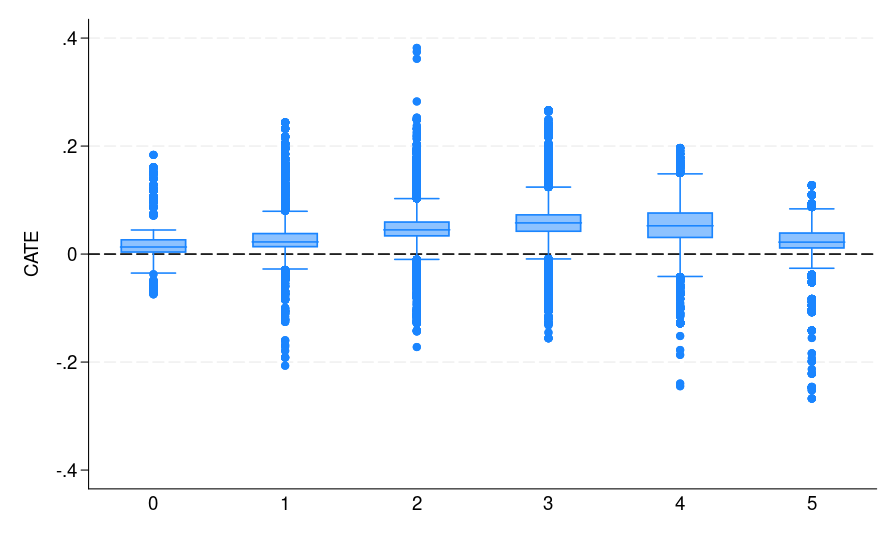 . // T-learner step 4: Estimate CATE and visualize . frame change default . _h2oframe get yhat1_1 yhat0_1 totalvote using social, clear . generate double catehat_T = yhat1_1 - yhat0_1 // CATE = treated prediction - control prediction . graph box catehat_T, over(totalvote) yline(0) ytitle("CATE")